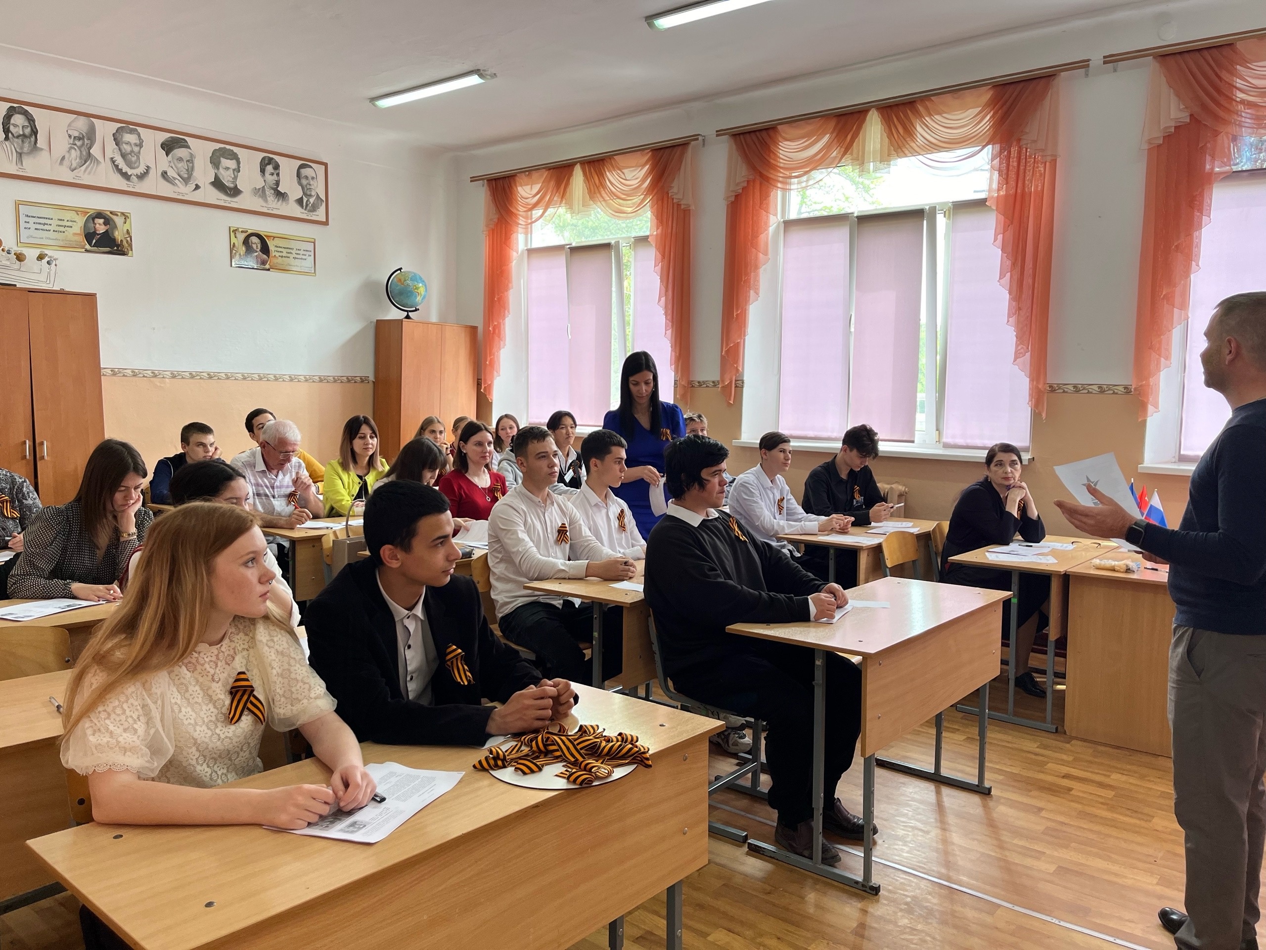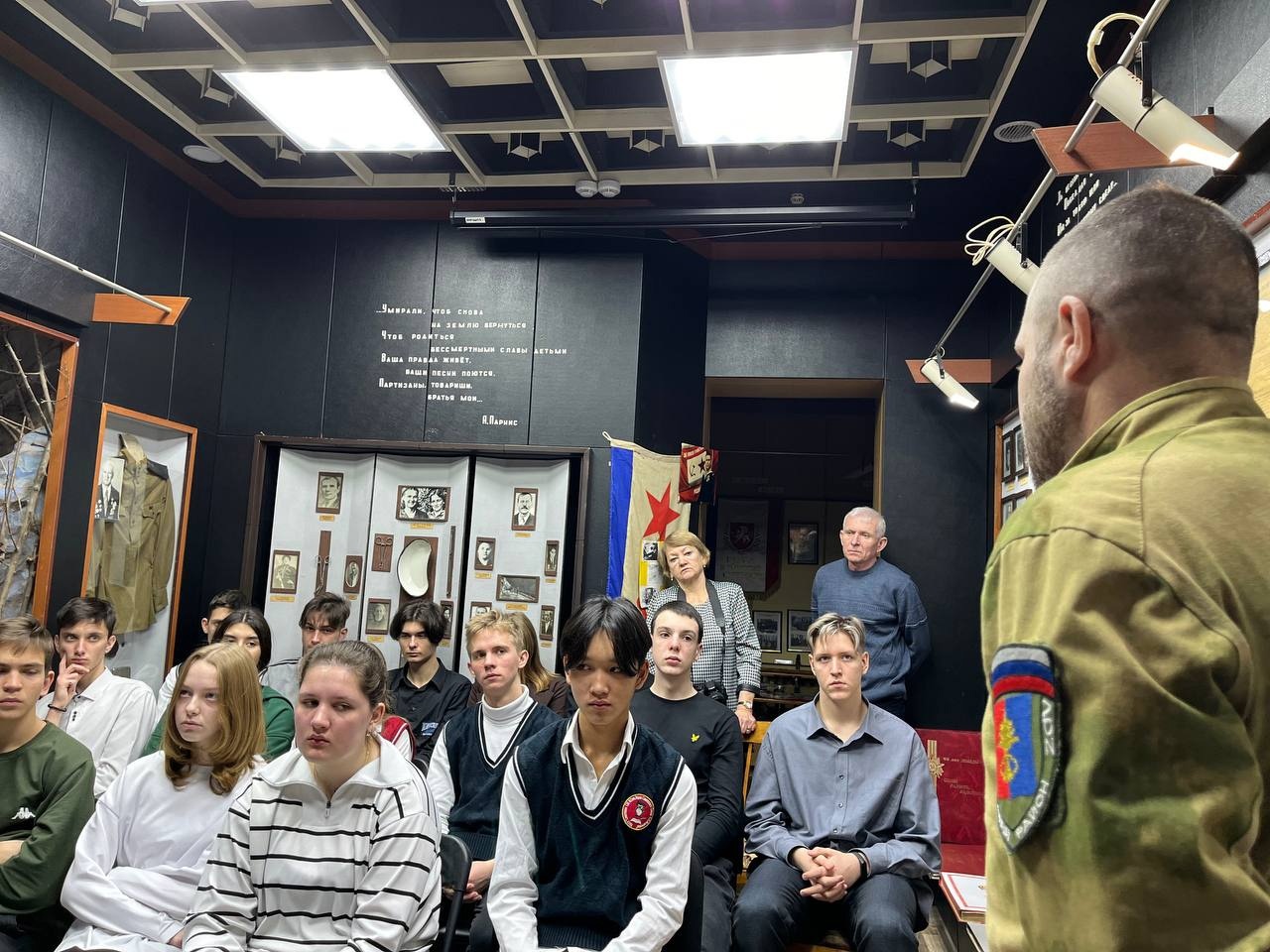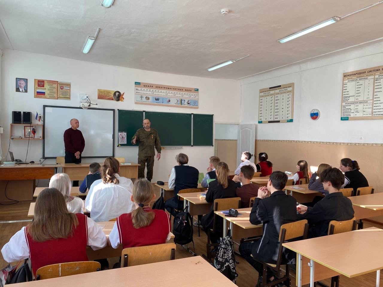 В преддверии этой значимой для всех нас даты, сотрудники Районного историко-краеведческого музея провели встречу учащихся 10 класса МБОУ «Советская СШ №2 им. Героя Советского Союза П.П. Исаичкина» с жителями Советского района: Данчуком Василием Михайловичем, участником Афганской войны, и Булатовым Константином, участником специальной военной операции на Украине - «Имею честь служить тебе, Россия».